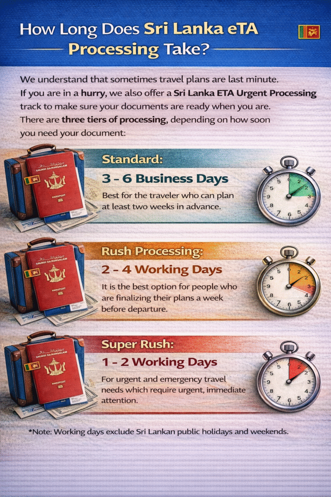 We understand that sometimes travel plans are last minute. If you are in a hurry, we also offer a Sri Lanka ETA Urgent Processing track to make sure your documents are ready when you are. There are three tiers of processing, depending on how soon you need your document: