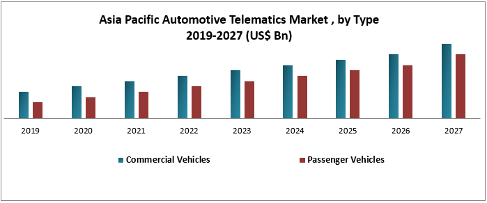 Asia Pacific Automotive Telematics Market was valued at US$ 8.2 Bn in 2019 and is expected to reach US$ 47.9 Bn by 2027, at a CAGR of 24.6 % during the forecast period.