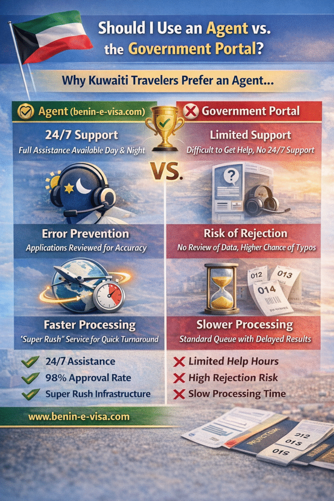 While you can apply directly through government sites, many Kuwaiti travelers prefer an agent like benin-e-visa.com for several reasons: