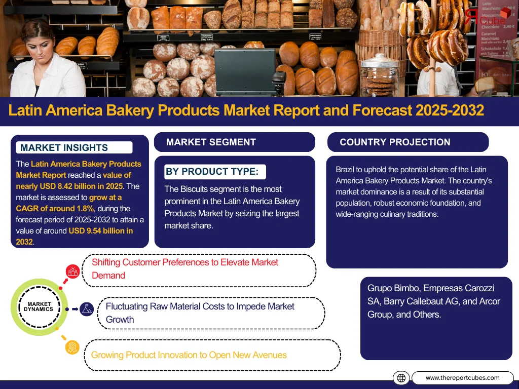 The Report Cube which is one of the leading market research company in UAE expects the Latin America Bakery Products Market to grow at a CAGR of around 1.8% through 2032, as highlighted in their latest research report. The study provides an in-depth analysis of the emerging trends shaping the Latin America Bakery Products Market and offers detailed forecasts for its potential growth during 2025–2032. The report also presents a comprehensive assessment of the competitive landscape, including profiles of leading players, their performance metrics, and recent strategic developments. Additionally, it explores the key market drivers, challenges, opportunities, and provides insights into historical and future revenue trends at the global, regional, and country levels.