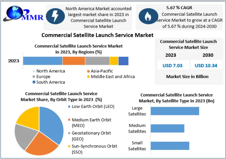 The Commercial Satellite Launch Service Market has emerged as a critical component of the global space economy, driven by rising demand for satellite-based services and technological advancements in launch systems. Valued at USD 7.03 billion in 2023, the market is projected to grow at a CAGR of 5.67% from 2024 to 2030, reaching approximately USD 10.34 billion by 2030.