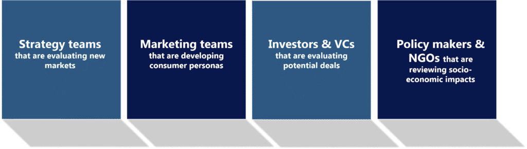 By analyzing existing studies, digital trends, and behavioral data, we uncover patterns in customer needs, expectations, and purchasing behavior across markets.