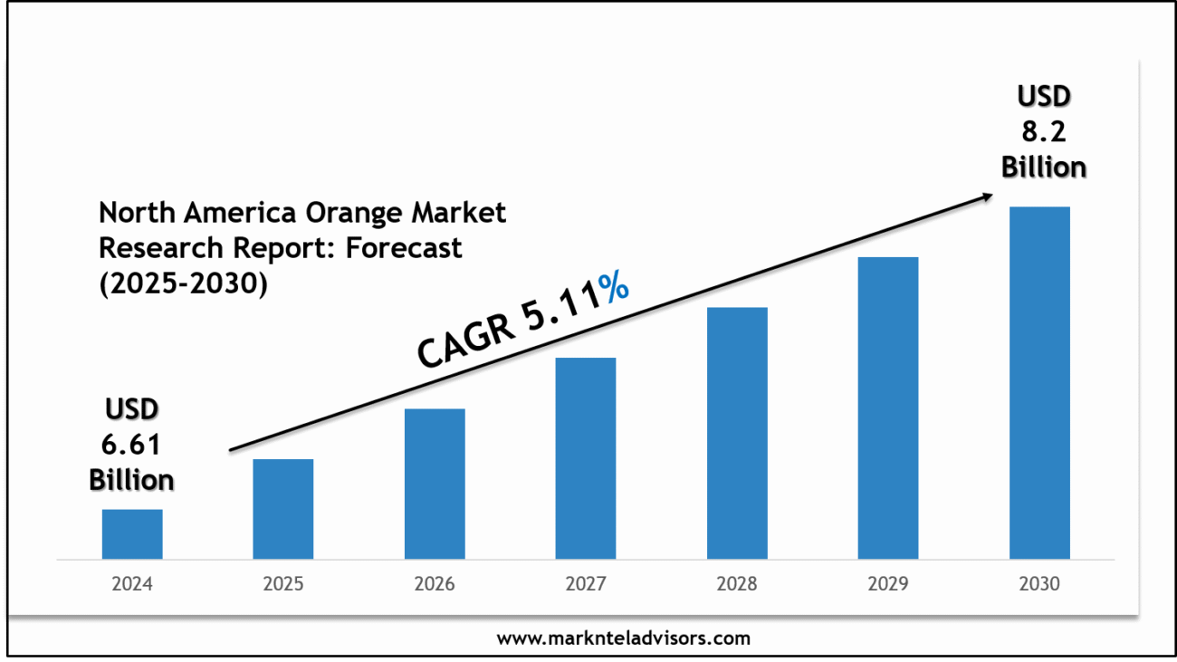 The North America Orange Marketsize was valued at around USD 6.61 billion in 2024 and is projected to reach USD 8.2 billion by 2030. The market is also estimated to grow at a CAGR of around 5.11% during the forecast period, i.e., 2025-30. The market growth is attributed to the health benefits related to orange consumption, the high demand for natural sources of Vitamin C, rising organic farming practices, rapid inclination towards natural personal care and cosmetic products, and robust demand for ready-to-consume bottled juices.