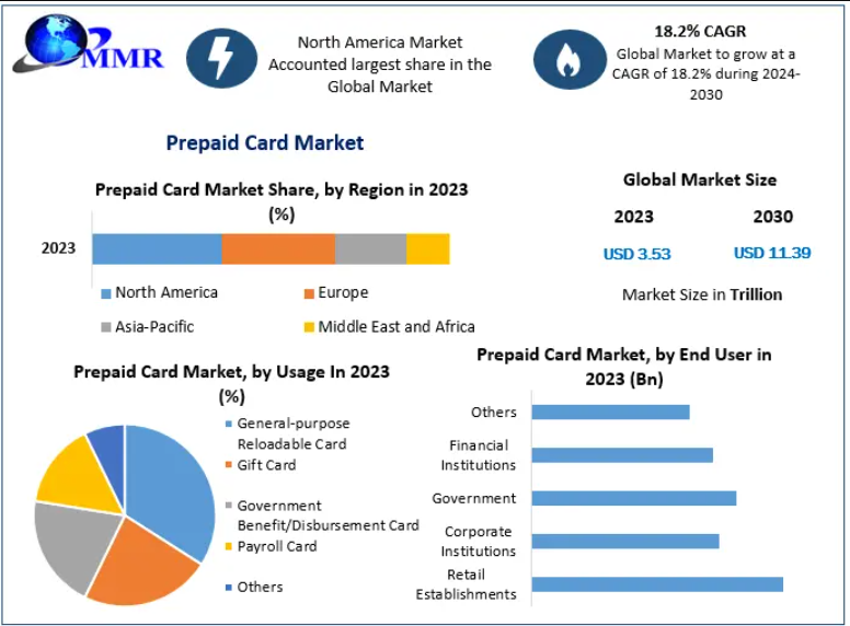 The Global Prepaid Card Market, valued at USD 3.53 trillion in 2023, is witnessing rapid expansion driven by digital adoption, fintech innovation, and rising demand for cashless payment instruments. The market is projected to grow at a CAGR of 18.2% from 2024 to 2030, reaching an impressive USD 11.39 trillion by the end of the forecast period.