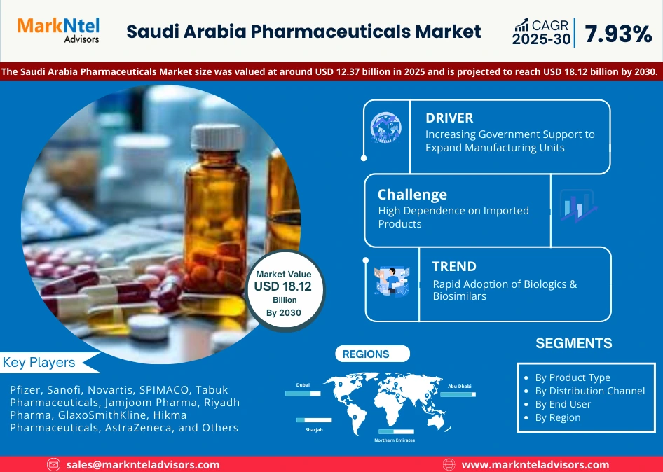 As per recent study by MarkNtel Advisors The Saudi Arabia Pharmaceuticals Market size was valued at around USD 12.37 billion in 2025 and is projected to reach USD 18.12 billion by 2030. Along with this, the market is estimated to grow at a CAGR of around 7.93% during the forecast period, i.e., 2025-30.