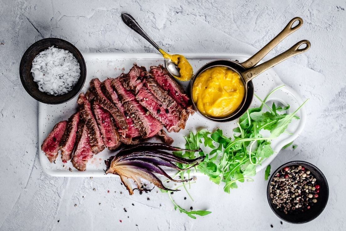 A smart griller knows that the meat is only half the story. The “meaning” of a grill session is often defined by the supporting cast on the plate. In the featured presentation, we see the inclusion of charred red onion and fresh arugula. Grilling vegetables alongside the protein introduces a smoky sweetness that raw greens simply cannot match. Furthermore, the addition of a bold mustard-based sauce provides the necessary acidity to cut through the richness of the beef’s fat, creating a balanced palate experience that keeps the diner engaged from the first bite to the last.