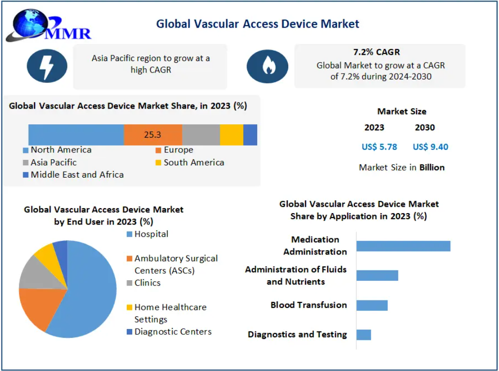 The Global Vascular Access Device Market, valued at US$ 5.78 billion in 2023, is projected to reach US$ 9.40 billion by 2030, expanding at a CAGR of 7.2% over the forecast period. Growth in this market is underpinned by the rising prevalence of chronic diseases, technological innovations in catheter materials, and the increasing shift toward outpatient and home-based care.
